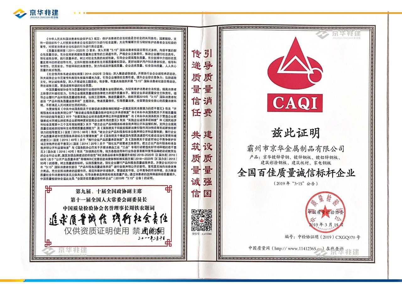霸州京華金屬制品有限公司作為一家專業(yè)生產(chǎn)冷軋帶鋼、鍍鋅帶鋼、鋅鋁鎂帶鋼、冷軋鋼板、鍍鋁鋅鋼板、彩涂鋼板的現(xiàn)代化民營企業(yè),自創(chuàng)立以來,始終堅持創(chuàng)新,不斷擴(kuò)大生產(chǎn)規(guī)模,通過了質(zhì)量管理體系ISO9001認(rèn)證、歐盟CE認(rèn)證等多項權(quán)威認(rèn)證,且榮獲了“全國百佳質(zhì)量誠信標(biāo)桿企業(yè)”、“中國建材企業(yè)50強(qiáng)”、“重合同守信用企業(yè)”等多項榮譽(yù)。