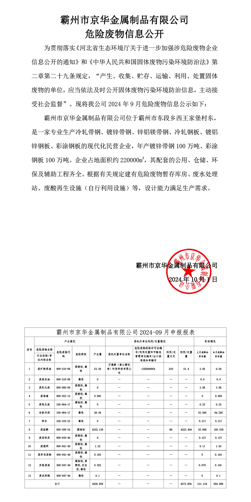 下一篇:24年10月危險廢物信息公開-霸州市京華金屬制品有限公司
